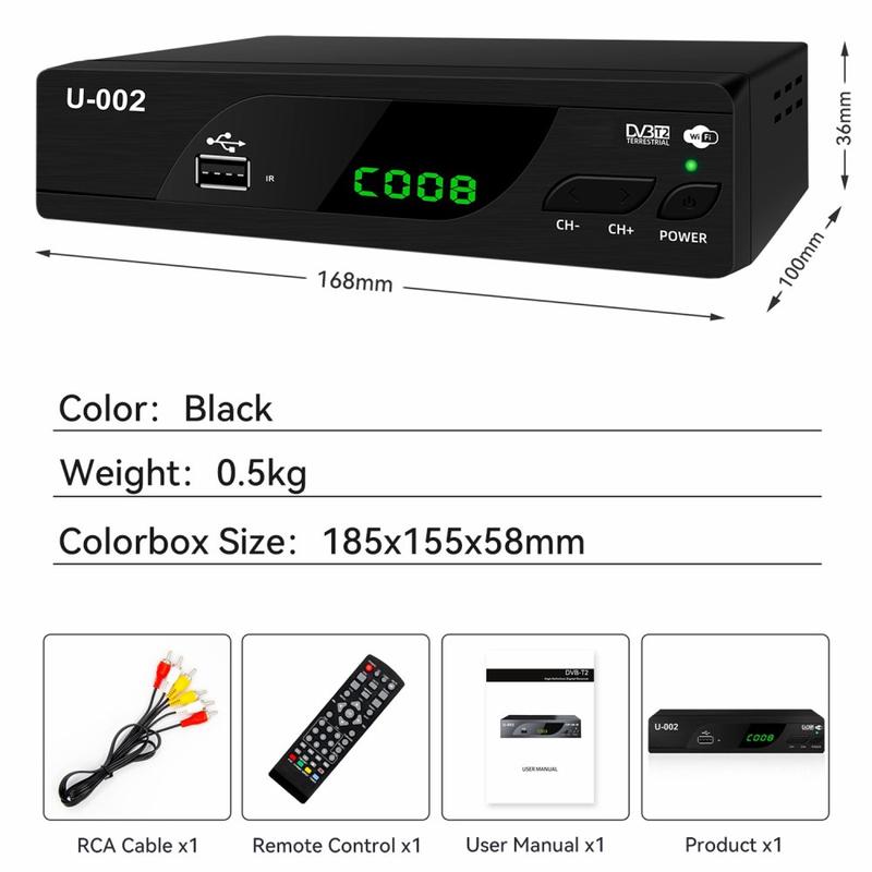 H.264 DVB-T2 U-002 WiFi TV Box er perfekt til alle, der ønsker at opgradere deres hjemmeunderholdningssystem til en overkommelig pris. Den er ideel til brugere, der ønsker at se tv i fuld HD, streame indhold online eller bruge en enkelt enhed til forskellige mediefunktioner. Med sin nemme opsætning og trådløse tilslutning er denne tv-boks tilgængelig for alle og giver en problemfri og fornøjelig seeroplevelse.
