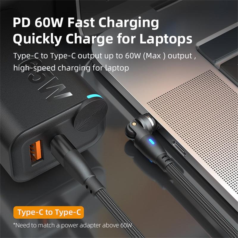 E9 USB-C til USB-C magnetisk kabel 1 m - 60 W PD hurtigopladning og USB 2.0-data, 540 graders rotation, nylonflettet