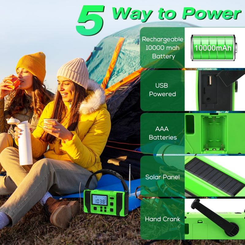Du vil aldrig stå uden strøm takket være fire alsidige opladningsmetoder: Solpanel (0,1 W), håndsvinggenerator, Type-C-indgang, AAA-batteribackup (AAA-batterier medfølger ikke). Dette sikrer, at radioen forbliver strømførende i nødsituationer, på campingture, i storme og på fjerne eventyr.