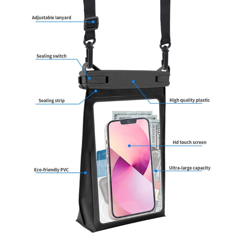 Med en ekstra forsegling for at styrke forseglingen, dobbeltforsegling og holde din telefon og andre ting tørre og sikre under ekstreme forhold. Dobbelt spænde i ABS-materiale sikrer langvarig brug for at forhindre vand, sand, sne og støv i at trænge ind