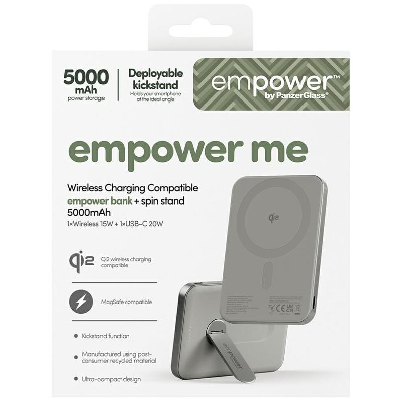 Empower by PanzerGlass Empower Bank med Spin Stand er en kompakt, holdbar powerbank, der er designet til hurtig og pålidelig opladning, uanset hvor du er. Den er kompatibel med Qi2 og MagSafe og leverer sikker magnetisk justering for effektiv trådløs opladning på iPhone 12-16-serien og andre Qi-kompatible enheder. Med et slankt design, indbygget spin-stativ og bæredygtige materialer er den skabt til daglig bekvemmelighed og langvarig brug.