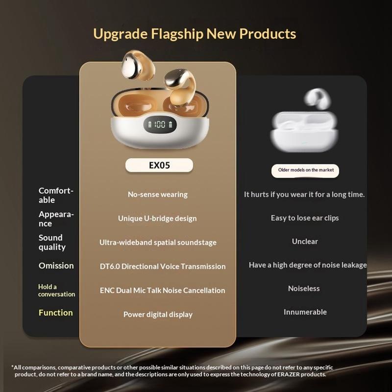 ERAZER EX05 er et godt valg for brugere, der ønsker et mere behageligt alternativ til traditionelle in-ear-øretelefoner. Det åbne clip-on-design gør dem nemme at have på i længere perioder, mens opladningsetuiet og batteridisplayet gør dem praktiske i hverdagen.