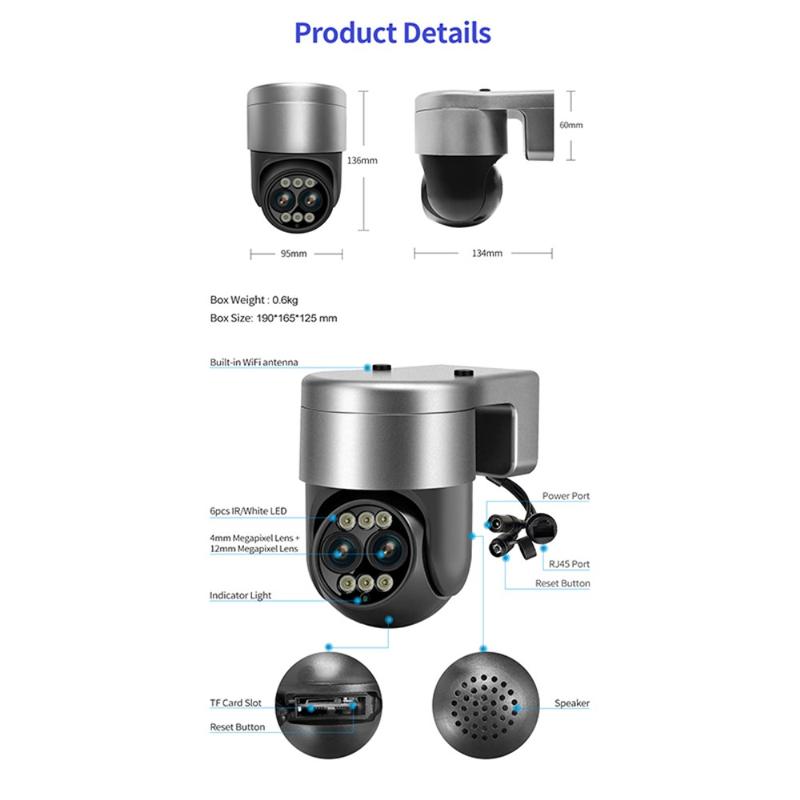 En vejrforseglet enhed scanner en hel parkeringsplads, zoomer tæt på nummerplader og taler tilbage til besøgende. Et bredt 4 MP-objektiv bevarer det store billede, mens et andet 4 MP-zoommodul leverer knivskarpe detaljer med op til 8 x forstørrelse - alt sammen streamet direkte til din telefon i realtid.