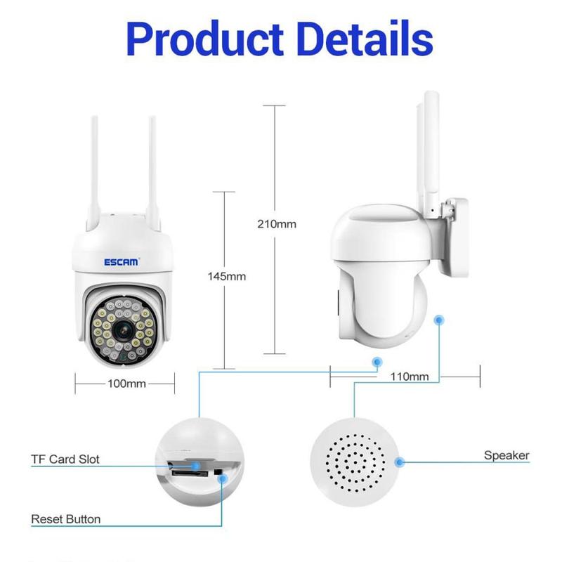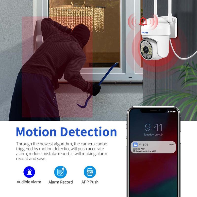 ESCAM PT305 giver pålidelig high-definition sikkerhed med fleksibilitet til både indendørs og udendørs brug. Den intelligente bevægelsesregistrering og push-meddelelser sikrer, at du altid er informeret om vigtige begivenheder, mens den dobbelte lyskilde sikrer klarhed under alle forhold. PT305 er nem at installere og er den perfekte tilføjelse til ethvert hjem eller enhver virksomhed.