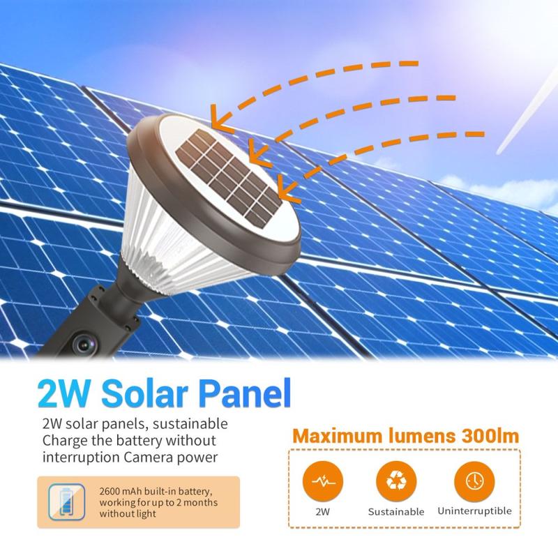 - Solenergi + dobbeltbatteri - Et 2W-panel forsyner lampecellen på 2000mAh og kameracellen på 2600mAh; bare 3-6 timers sollys holder enheden kørende i ugevis.