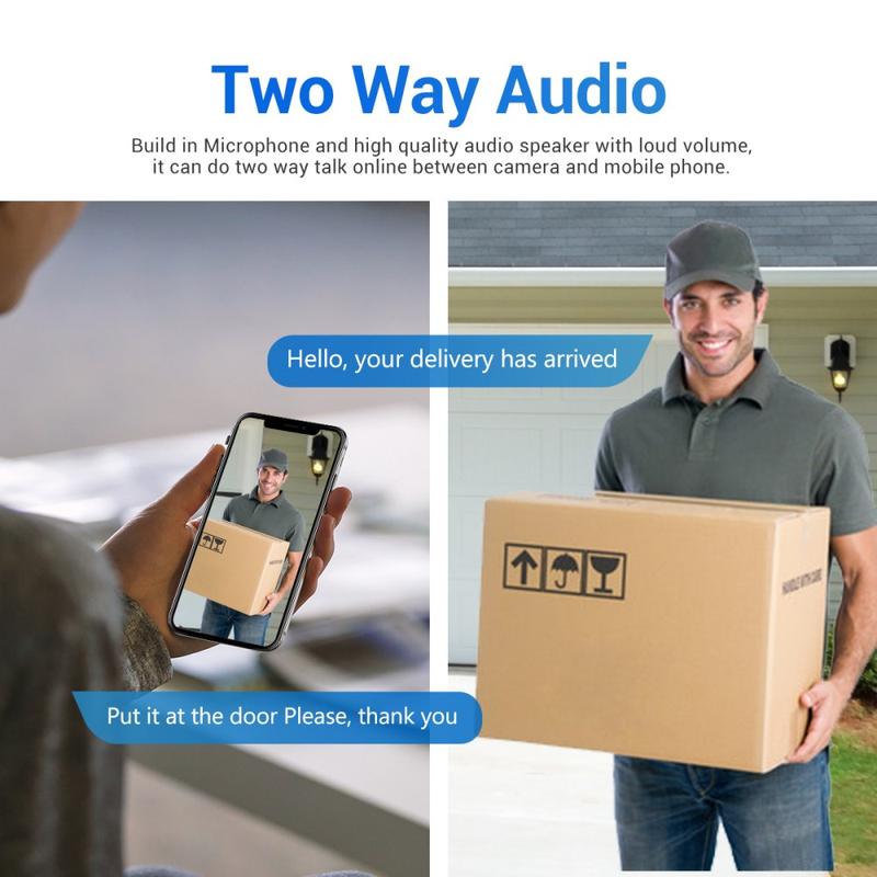 - Tovejs stemme: indbygget mikrofon og højttaler lader dig tale med besøgende eller afskrække ubudne gæster.