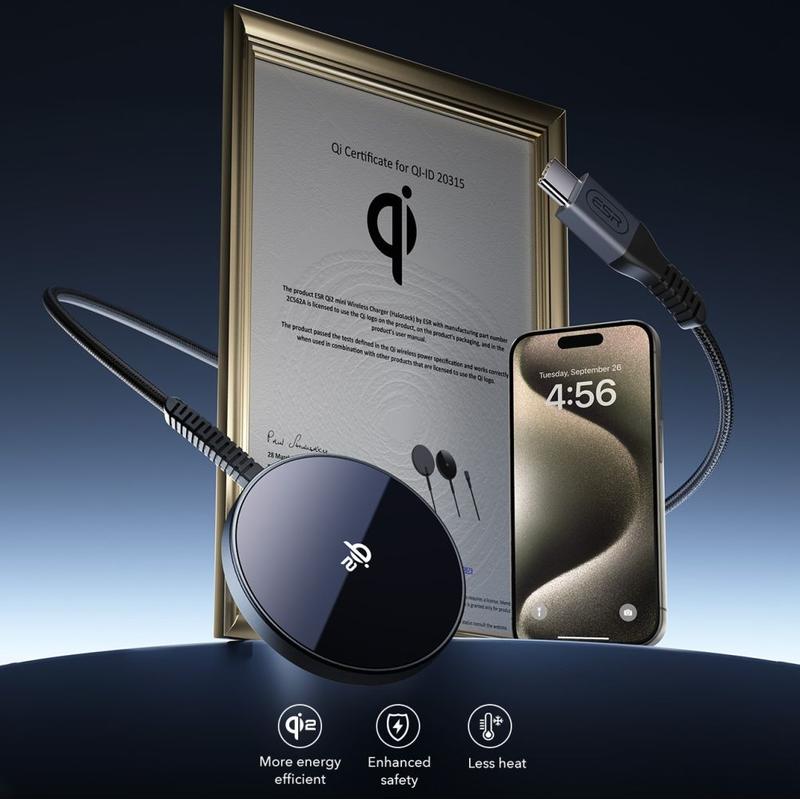 ESR HaloLock Qi2 Mini er en moderne oplader udstyret med avancerede funktioner, der sikrer bekvem og sikker opladning af din telefon. Stærke magneter skaber en solid forbindelse til din telefon, hvilket betyder hurtigere og mere pålidelig opladning, selv mens du bruger enheden. HaloLock Qi2 Mini oplader din telefon hurtigere end andre MagSafe-opladere takket være dens avancerede varmeafledningsdesign, der opretholder maksimale opladningshastigheder.