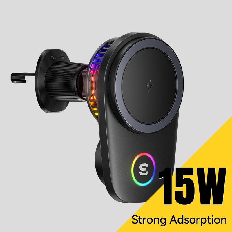 Essager 15W magnetisk trådløs oplader/bilholder med køleventilator, RGB-belysning og fastgørelse til ventilationsåbning - MagSafe-kompatibel