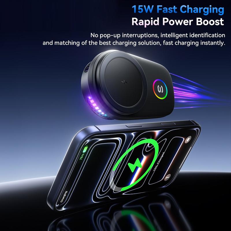 Sørg for, at din telefon er opladet, synlig og sidder sikkert fast med ESSAGER 15W magnetisk trådløs biloplader. Denne ventilationsgitterholder er designet til bilister, der ønsker en mere overskuelig og praktisk løsning, og kombinerer hurtig trådløs opladning, stærkt magnetisk greb og aktiv køling i ét kompakt tilbehør. Den indbyggede RGB-belysning giver et moderne touch, mens 90-graders drejefunktionen gør det nemt at skifte mellem stående og liggende visning til navigation, opkald eller musikstyring.