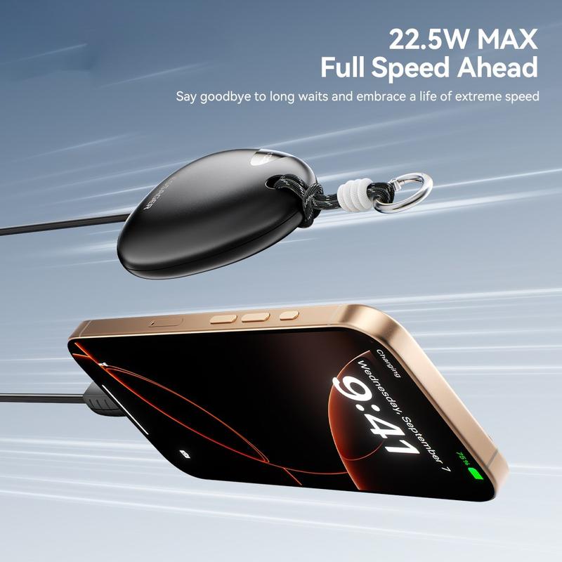 ESSAGER 10000mAh Fast Charging Power Bank tilbyder pålidelig strøm på farten med et indbygget udtrækkeligt 70 cm Type-C-kabel. Den er designet til rejser, pendling og udendørs brug og leverer op til 22,5 W hurtigopladning, samtidig med at den er kompakt, let og nem at bære takket være den integrerede karabinhage.