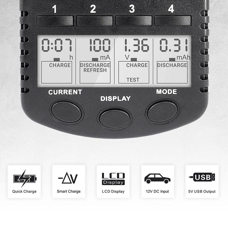 - Fire driftstilstande: opladning, afladning, genopfriskning og en kapacitetstest, der vises i mAh
