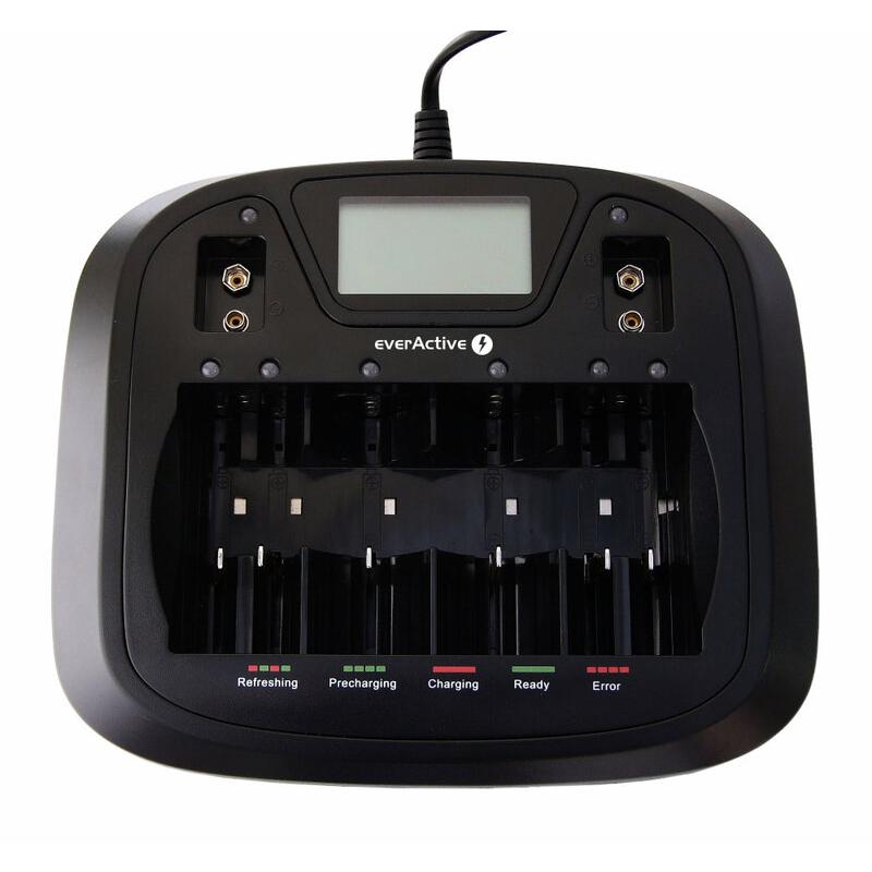 Hurtig, pålidelig, alsidig CPU-oplader med LCD everActive NC-900U med USB-stik. Har 8 helt uafhængige smarte opladningskanaler med refresh/unload-funktion. 6x R03 AAA, R6 AA kan udskiftes med 4x C R14, D R20 + 2 kanaler til 9V/6F22-celler, oplader ubesværet enkeltceller og mærkelige, usædvanlige batterikonfigurationer.