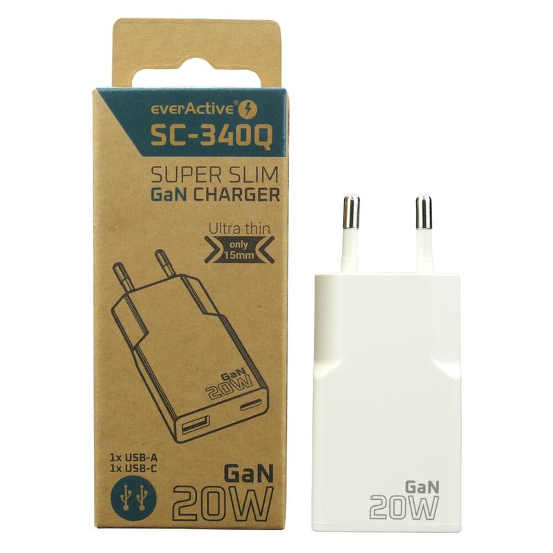 everActive SC-340Q GaN Super Slim 20W vægoplader med USB QC3.0 og USB-C PD-porte