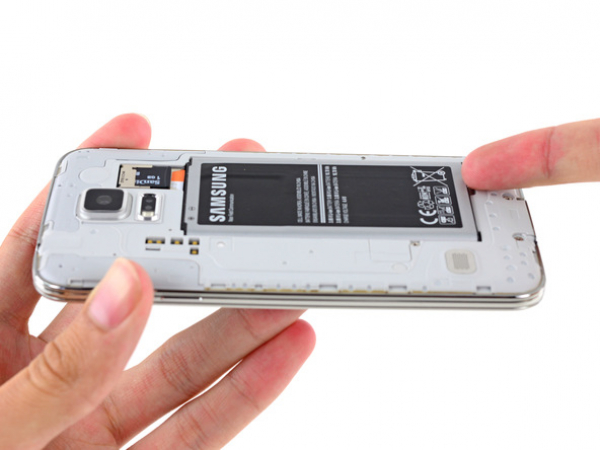 Der er en fordybning i nederste højre hjørne af telefonens batteri. Tryk et plaståbningsværktøj ind i fordybningen eller brug en negl til at løfte batteriet op.
