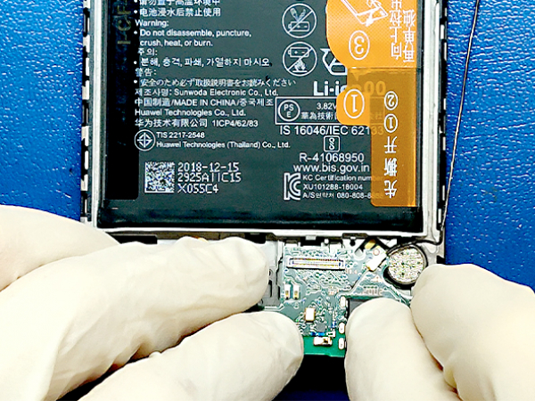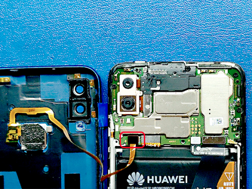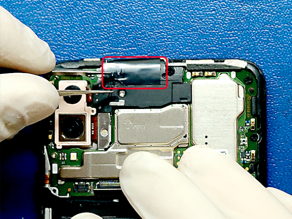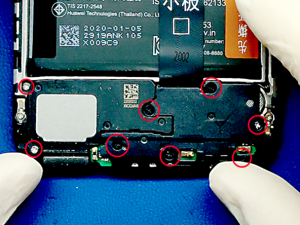 - Fjern den sorte antistatiske tape fra den øverste del af bundkortet. - Fjern de 7 skruer, der fastgør bundkortet og den øverste beslag. - Fjern beslaget, der beskytter frontkameraet, sensorerne og højttaleren. - Afmontér antennen. - Tag stikket ud og fjern de bageste kameraer. - Fjern logikkortet.