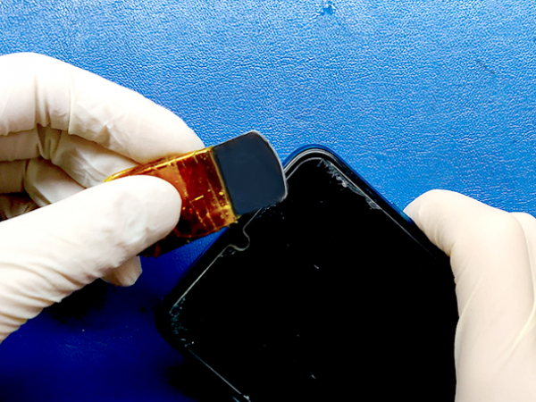 - Hvis displayglasset er knækket, skal du forhindre yderligere brud ved at tape glasset over med tape. - Læg overlappende strimler af klar selvklæbende tape over displayet.