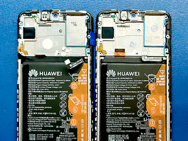 - Sammenlign den nye og den gamle displayenhed. - Den reservedel, som vi bruger, leveres som en enhed: - Skærmen er fastgjort til midterrammen, - batteriet, - højttaleren - vibrationsmotoren. - Vi vil flytte det nederste logikkort, bundkortet og kameraerne.