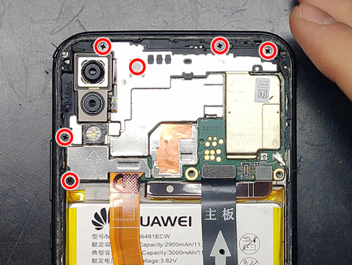 - Fjern beskyttelsen der sidder øverst. - Frakobl og fjern kameraet foran. - Frakobl antennekablet forsigtigt. - Frakobl og fjern det primære dobbeltkamera. - Lirk og fjern main-boardet fra telefonen.