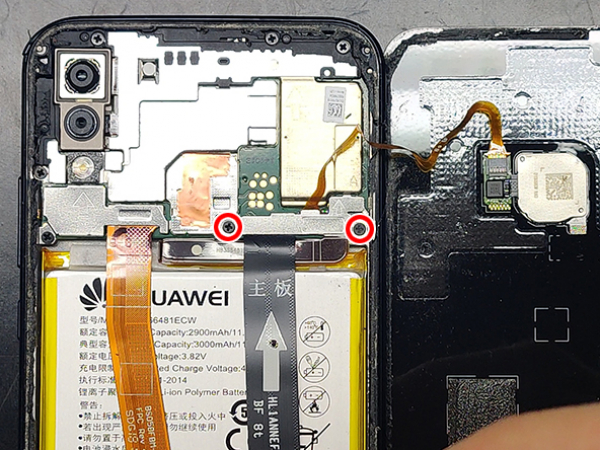 - Fjern de to skruer der fastholder batteristikkets og fingeraftrykssensorens metalbeslag. - Fjern beslaget og frakobl batteriet og fingeraftrykssensoren. - Sidst skal du frakoble flexkablet til SUB-boardet.