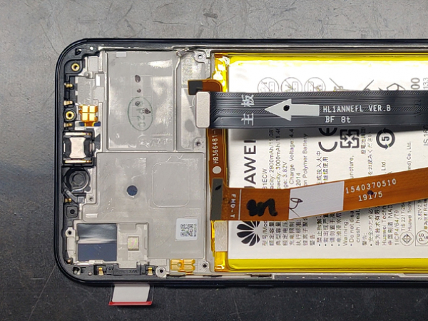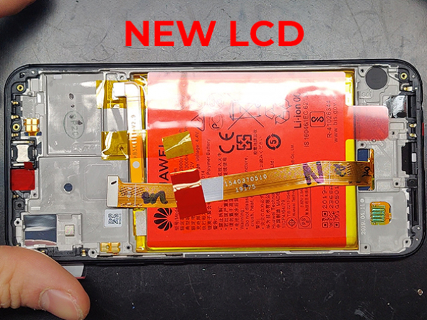 - Vi bruger en komplet skærm. - Det inkluderer et LCD (skærmen), rammen og batteriet. - Fjern alle beskyttende klistermærker fra den nye skærm. - Indsæt SUB-boardet igen. - Pak antennekablet ind i udhulningen i højre side af rammen. - Indsæt højttaleren og fastgør den med de 7 skruer.