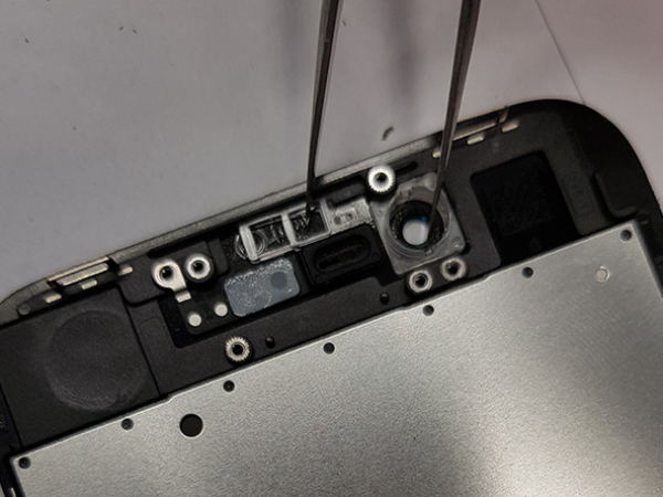 - Fjern de skruer, der fastgør højtaleren og sensoren. - Løft forsigtigt metalbeskyttelsesskjoldet op, og tag det af. - Fjern ørehøjtaleren - Hæv nu de fire skruer, som holder Home-knappen, ud - Fjern metalbeskyttelsen - Fjern tre skruer fra venstre og tre skruer fra højre af skjoldet - Løsn de øverste sensorer, home-knappen og metalbeskyttelsen. - Løsn plastikholdere til kamera og sensorer og sæt dem på plads på den nye reserve Tip: - Varm skærmen op for at få limen til at løsne sig