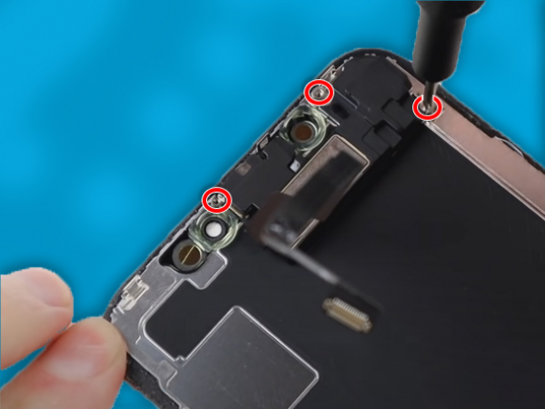 - Fjern de skruer der fastholder højttaleren og sensoren. - Lirk forsigtigt under toppen af højttaleren og vend den. - Vær forsigtig da højttaleren stadig er forbundet. - Opvarm toppen af telefonen og fjern forsigtigt sensoren.