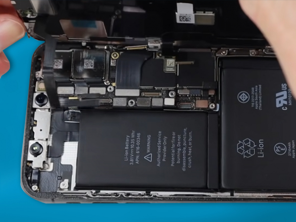 - Fjern de fem Y000 trepunkts skruer der holder bundkortets stikbeslag fast. - Fjern stikbeslaget forsigtigt. - Frontpanelets sensorrække stik skal frakobles. - Lirk kabelstikket til OLED-panelet med din negl eller din spudger. - Brug spidsen af en spudger til at lirke digitizer kabelstikket op. - Frontpanelets sensorrække kabel sidder mere eller mindre løst på. - Løft forsigtigt kablet indtil limen adskilles. - Telefonens skærm fjernes.