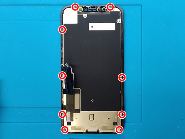Sæt de 9 skruer fra det gamle LCD tilbage og fastgør skjoldet til det nye LCD.
