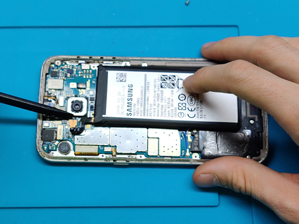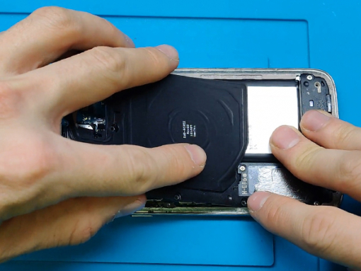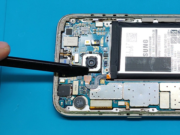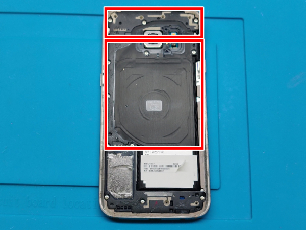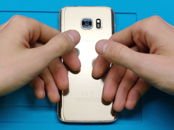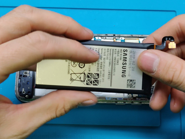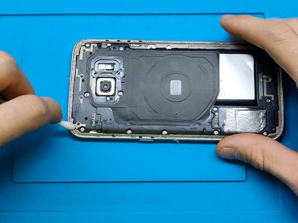 Når bagside glasset skal sættes på igen, bruges den klæbende dobbeltsidede tape, som også blev brugt til batteriet.