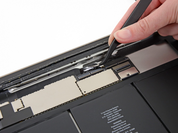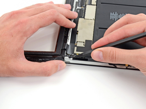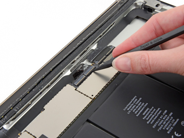 • Et stykke tape sikrer digitizer-båndkabelet til hovedkortet. Pirk det af med en pincet.