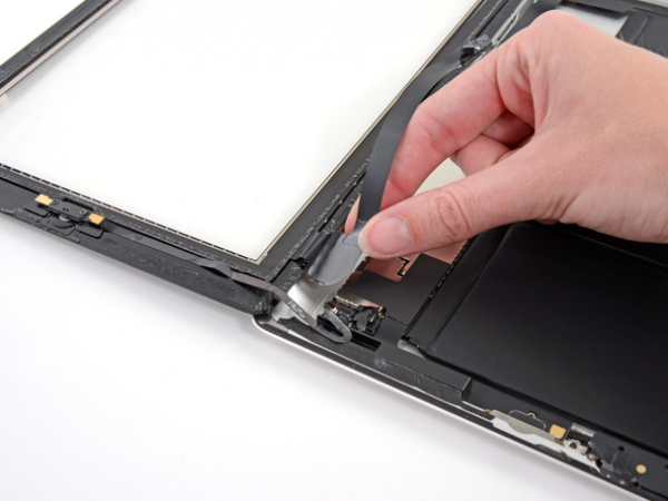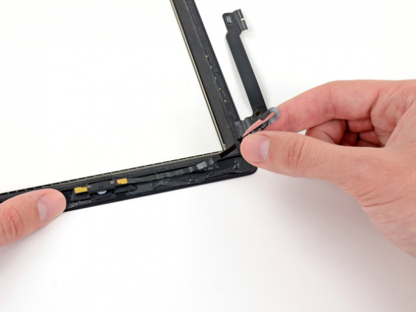 • Pirk af digitizer-fladkabelet. Skil kabelet fra limen som fastgør den til aluminiumsbagcoveret med den flade enden af en spudger.