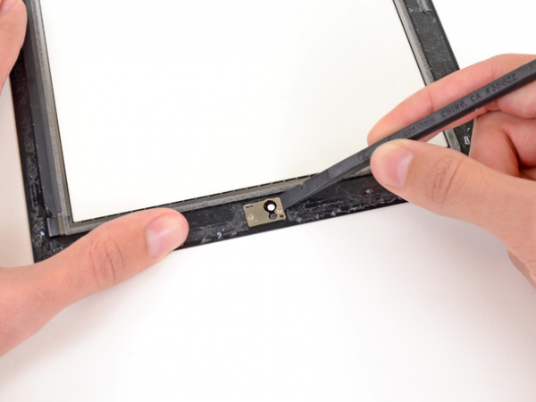 • Skub kameraspændet ud af limen som fastgør den til frontpanelet med den flade enden af en spudger.