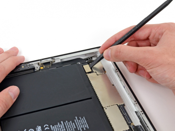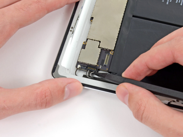 Pirk af digitizer-fladkabelet. Skil kabelet fra limen som fastgør den til aluminiumsbagcoveret med den flade enden af en spudger.