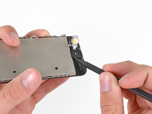 Fjern de to 1,3 mm Phillips-skruer, som fastgør hjemknappens spænde til skærmenheden.