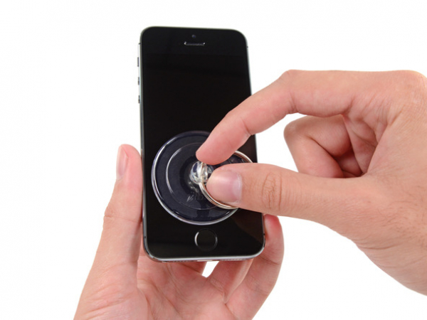 • Hold iPhonen nede med den ene hånd og træk sugekoppen op med den anden. Skil frontpanelet (hjem-knap-delen) lige præcist fra bagcoveret.