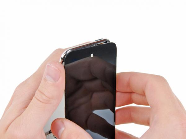 IPod Touch 4G frontpanel er fastgjort til bagcoveret med lim. Det anbefales at bruge en varmepistol for at blødgøre limen.