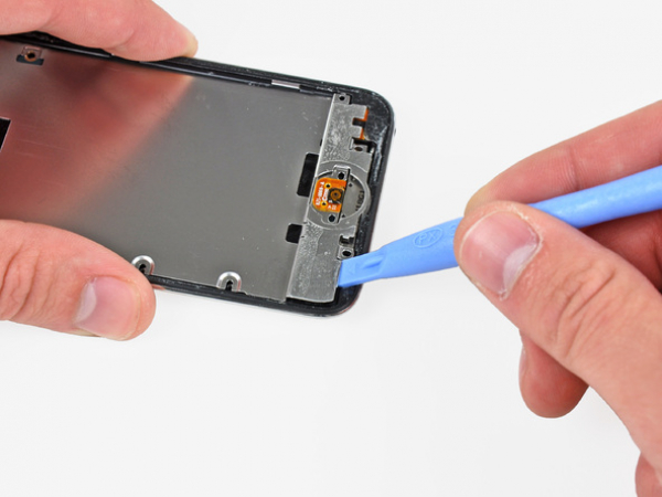 Brug kanten af et åbningsværktøj til at lirke det tynde metalcover op fra det bageste kamera.