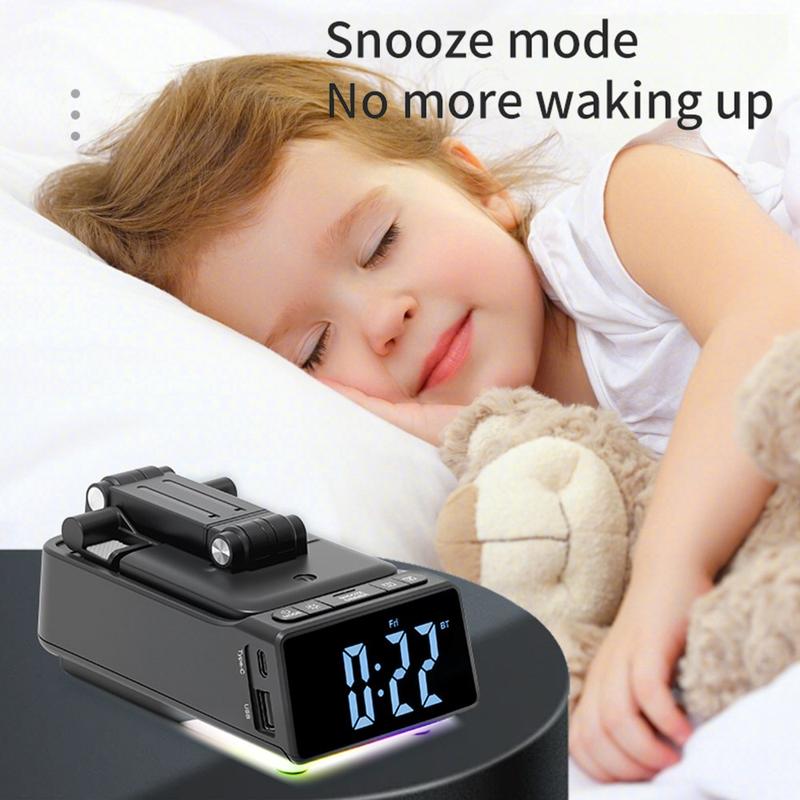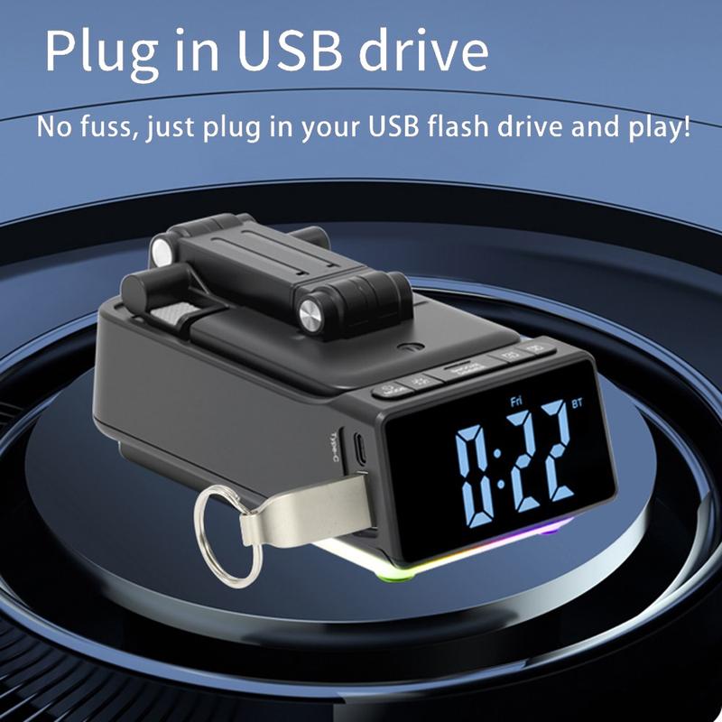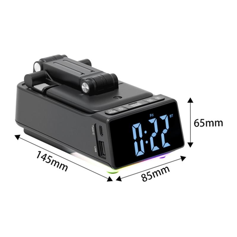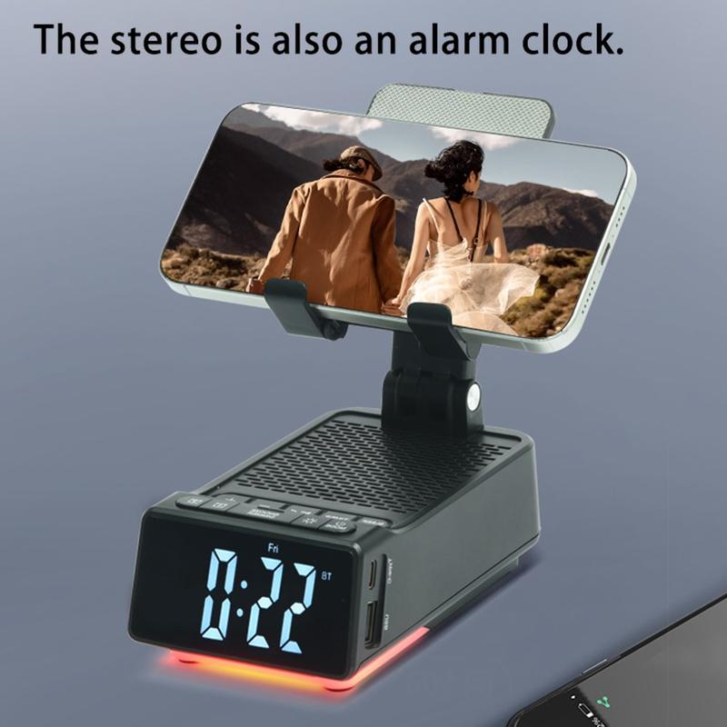 - Alt-i-en-fleksibilitet - Kombinerer et justerbart telefon/tablet-stativ med metalhængsler (understøtter op til 3 kg), en Bluetooth-kompatibel 5 W-højttaler med basmembran og et fuldt funktionsdygtigt vækkeur.