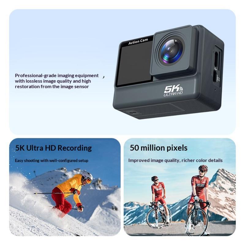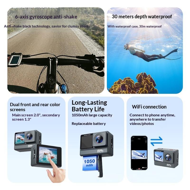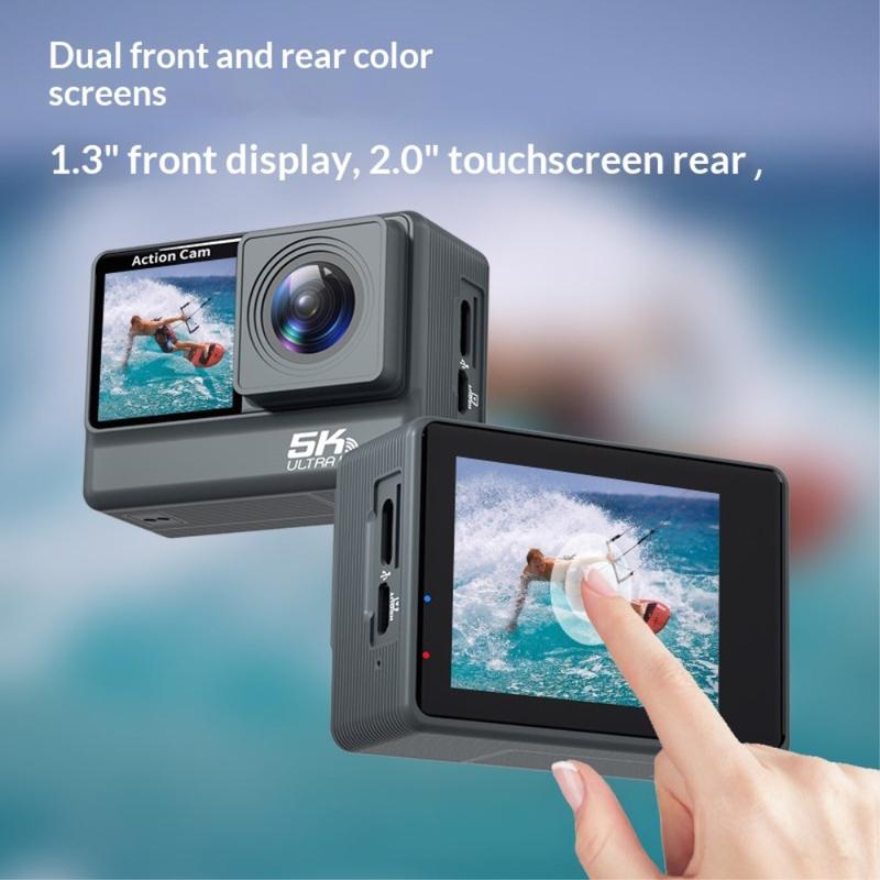 F308AATR Actionkamera med dobbelt skærm - 5K HD-sportskamera med 6-akset stabilisering, WiFi og vandtæt etui