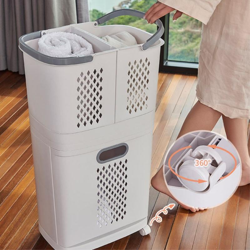 F867 Vasketøjskurv med 3 kurve og hjul - fritstående, transportabel tøjorganisator