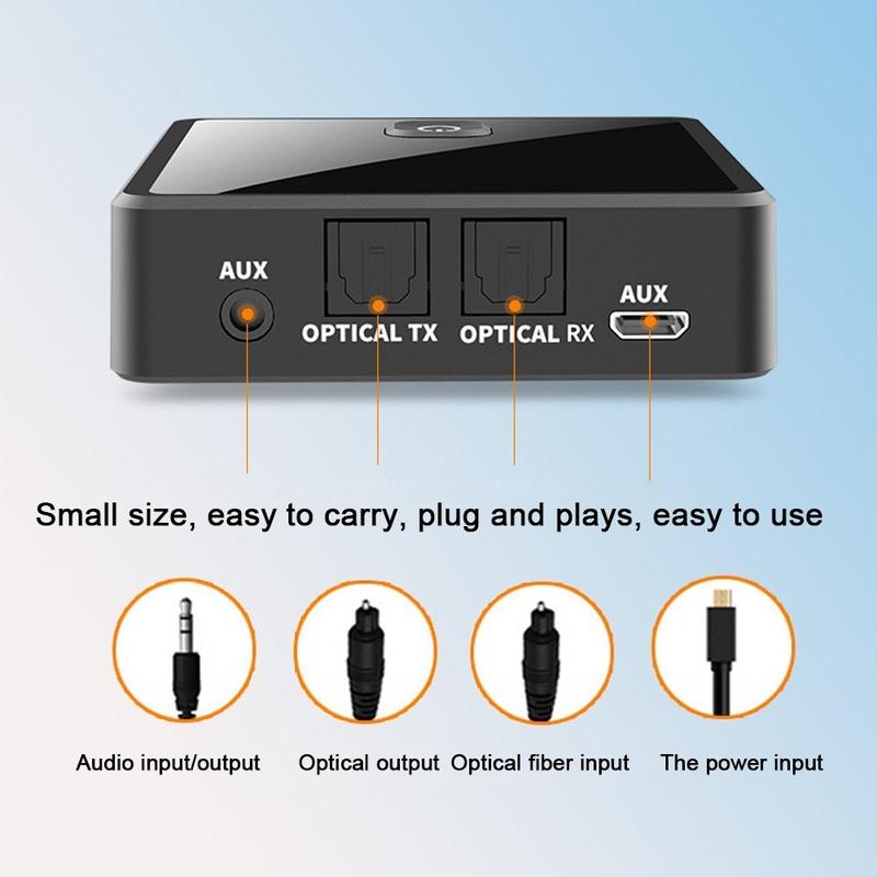 Adapteren er udstyret med optisk fiber, 3,5 mm AUX og RCA-grænseflader (rød/hvid) og understøtter en bred vifte af lydsystemer. Denne fleksibilitet gør det nemt at tilslutte tv'er, computere, effektforstærkere, højttalere og lydsystemer og samtidig opretholde en klar lydydelse med lav latenstid.