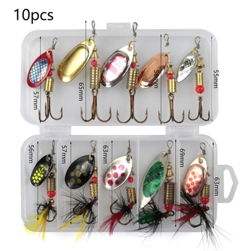 Dette spinnesæt med 10 dele giver fremragende værdi med en række effektive blink i bionisk stil pakket i en kompakt opbevaringsboks. De roterende pailletter, robuste tredobbelte kroge og den holdbare metalkonstruktion gør det til et pålideligt valg til at forbedre fangstsuccesen, samtidig med at dit udstyr er organiseret og let at transportere.