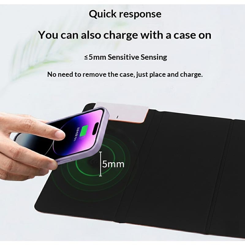 Det indbyggede trådløse opladningsmodul understøtter op til 15W hurtig opladning og leverer hurtig og effektiv strøm til kompatible smartphones. Med ultratynd sensorteknologi (≤5 mm) oplader den pålideligt, selv gennem de fleste mobiltasker.