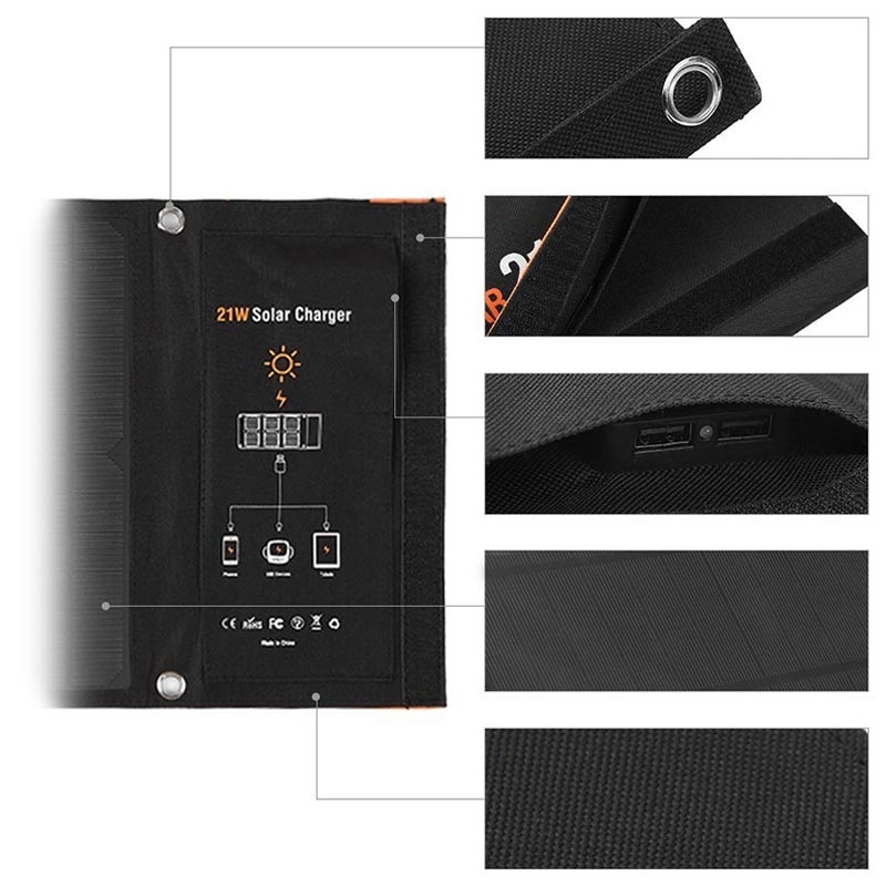 powerbank og andre enheder. Denne solcelleoplader har tre højeffektive paneler og leverer hurtig opladning op til 21W.