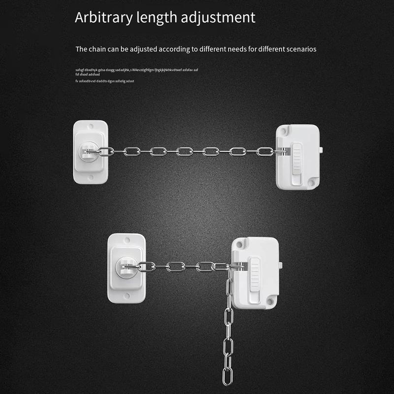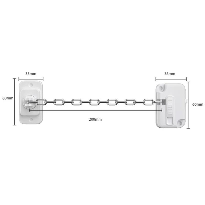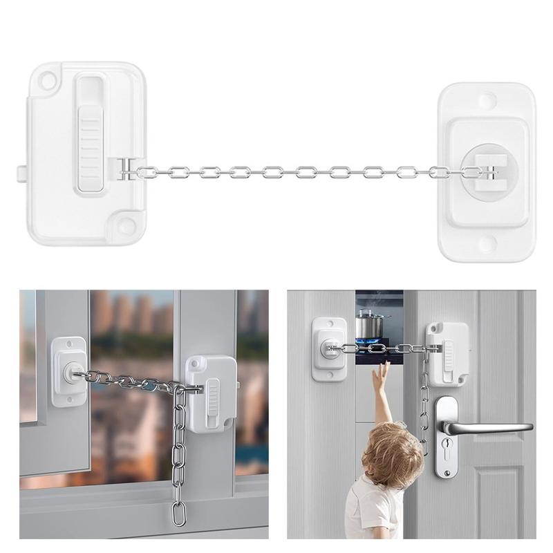 FT756 Adjustable Chain Safety Lock er designet til at sikre vinduer, skuffer, skabe og skydedøre og hjælper med at forhindre utilsigtede fald eller skader på spædbørn og kæledyr. Med sin stærke kæde i rustfrit stål og holdbare ABS-konstruktion giver den pålidelig beskyttelse uden at gå på kompromis med ventilation eller bekvemmelighed.