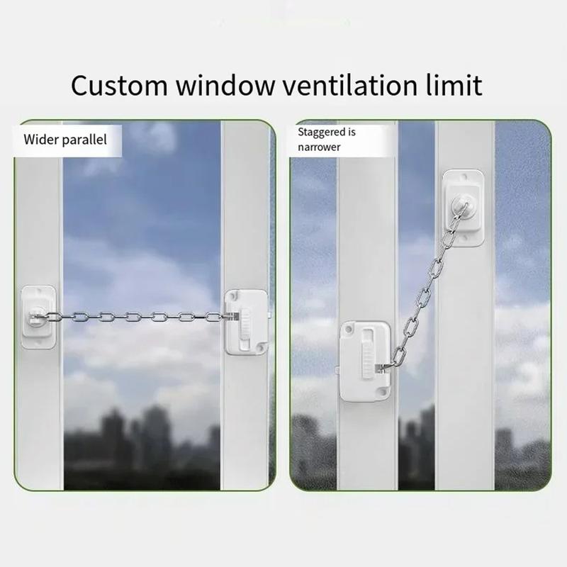 Den justerbare kædelængde giver dig mulighed for at bestemme, hvor langt et vindue eller en dør kan åbnes. Denne funktion sikrer korrekt luftgennemstrømning, samtidig med at børn og kæledyr holdes sikkert indendørs, hvilket gør det til et fremragende sikkerhedstilbehør til hjem og lejligheder.