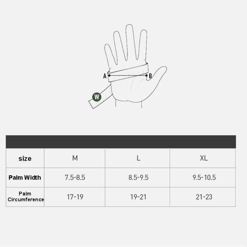 - Størrelse M: Håndfladebredde: 7,5-8,5 cm, håndfladeomkreds: 17-19 cm