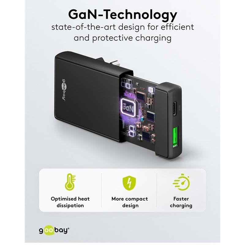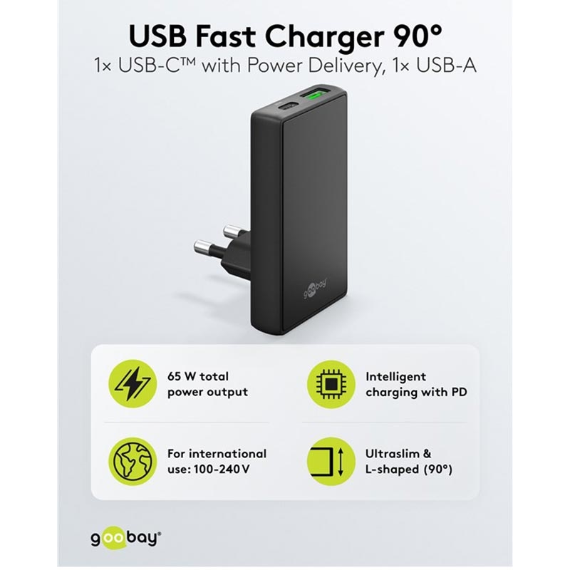 Goobay GaN Dobbelt hurtigoplader 90° Flat 65W - ultraslank vægoplader med USB-C- og USB-A-porte