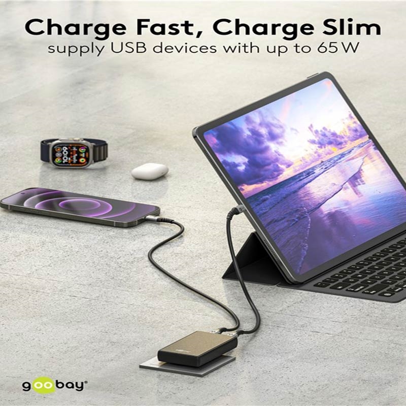 Med 65W USB-C PD-output kan opladeren forsyne smartphones, tablets og endda højtydende notebooks som MacBooks, Lenovo, HP, Dell, Samsung m.fl. med strøm.