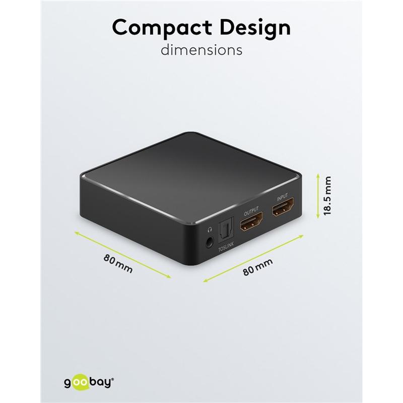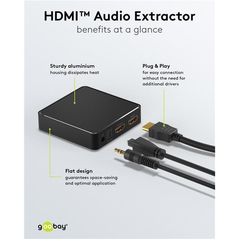 HDMI™-omvandlaren sender den bedste digitale og analoge lydkvalitet til enheder uden egen HDMI™-anslutning, t.ex. hörlurar, hifi-anlæg, soundbar eller TV. HDMI™-splitter omvandler den kommende digitale HDMI™-lydsignaler til et analogt stereosignal for tilsluttede slutenheder. Via HDMI™-udgangen opnår HDMI™-lydextraktoren en videoopløsning på maks. 4K2K @ 30 Hz og understøtter også 3D. Plug & Play gør det enkelt at tilslutte S/PDIF-splitter uden at installere yderligere driverrutiner. Robust aluminiumhölje som slipper ud varme og gør det enkelt at håndtere kablar tack vare anslutningerne på bagsiden. Utrustet med guldpläterede kontakter til korrosionsbeskyttelse og højkvalitativ signaloverførsel